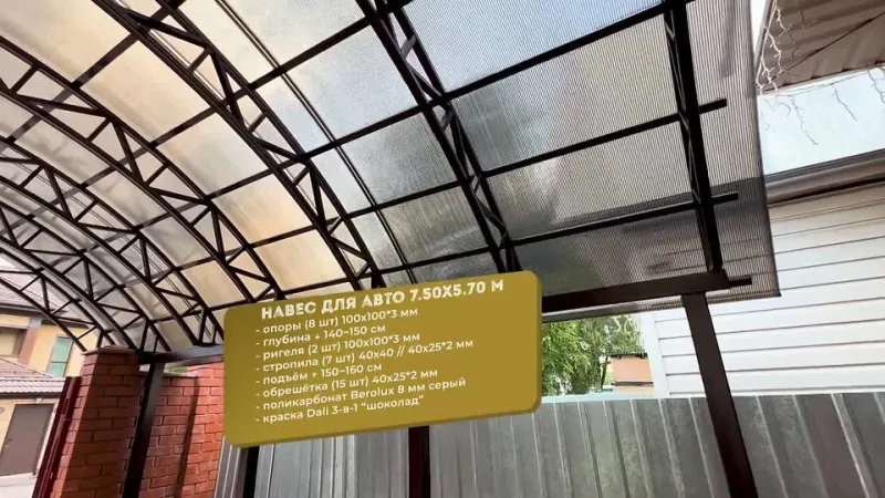 Задача компании – сделать надежный, функциональный и долговечный навес из поликарбоната по требованиям заказчика. Для этого разработана система изготовления, предусматривающая контроль материалов, каждого элемента конструкции, соблюдения технологии монтажа. Все это показано в видеоматериалах.